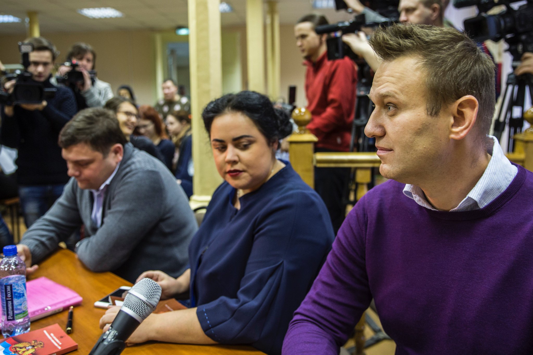 В зале присутствует Алексей Навальный с адвокатами Вадимом Кобзевым и Ольгой Михайловой и Петр Офицеров с адвокатом Светланой Давыдовой. Помимо журналистов текстовую трансляцию из зала суда успевает вести и Навальный.