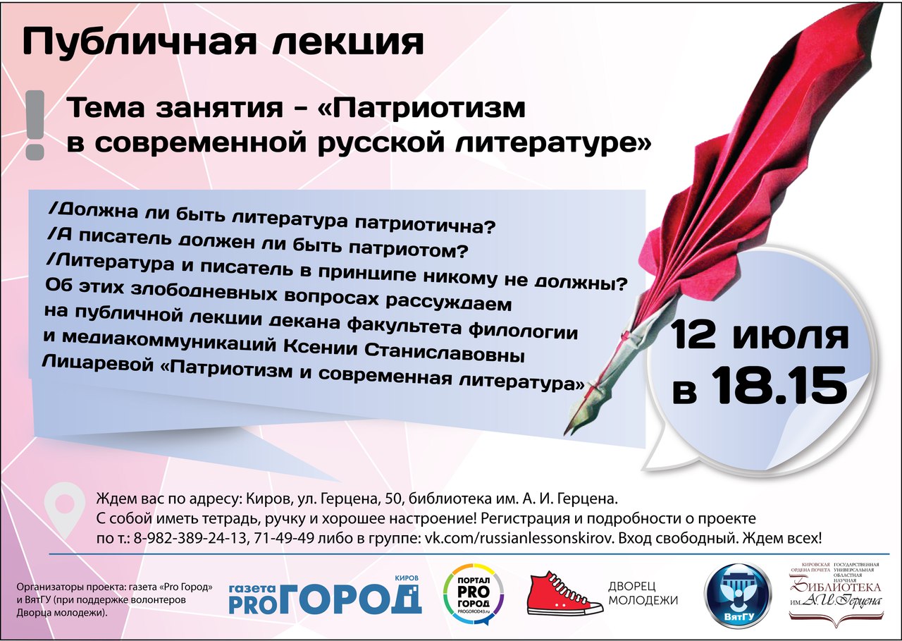 Участие. Публичная лекция «Патриотизм и современная литература» пройдет 12 июля с 18.15 до 19.15 по адресу: Киров, улица Герцена, 50. Вход свободный. С собой брать ручку и блокнот. Регистрация на мероприятие по т.: 89823892413, либо в группе: Уроки русского языка и литературы с газетой "Pro Город"