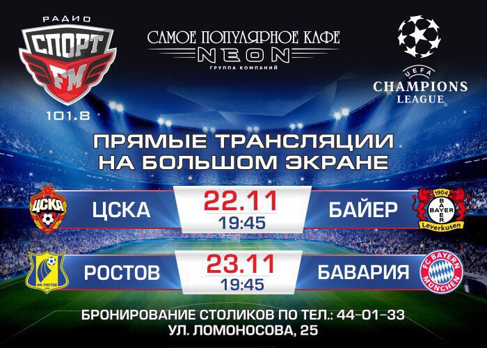 Матч «ЦСКА» - «Байер» смотрим 22 ноября в 19:45, матч "Ростов" - "Бавария" смотрим 23 ноября в 19:45 по адресу: Ломоносова, 25!