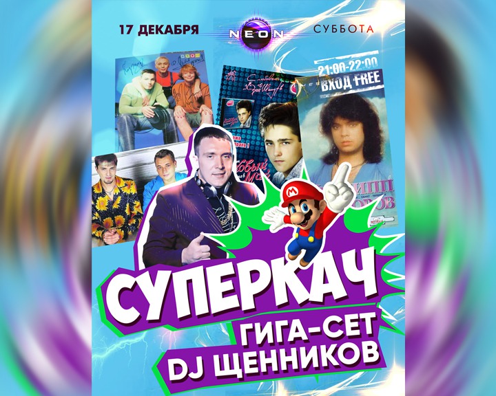 - На этот раз за пультом предстанет один из ветеранов РЦ NEON - DJ ЩЕННИКОВ! Все Хиты 90-х и 2000-х на 2 этаже РЦ NEON! Воспоминания детства, молодости, юности нахлынут на вас сразу же, как только вы зайдете на танцпол. Также для вас будет работать спецгость: MC SOROKIN! Красочные эмоции, тематические костюмы и море всем известной музыки в эту ночь и только для гостей РЦ NEON!