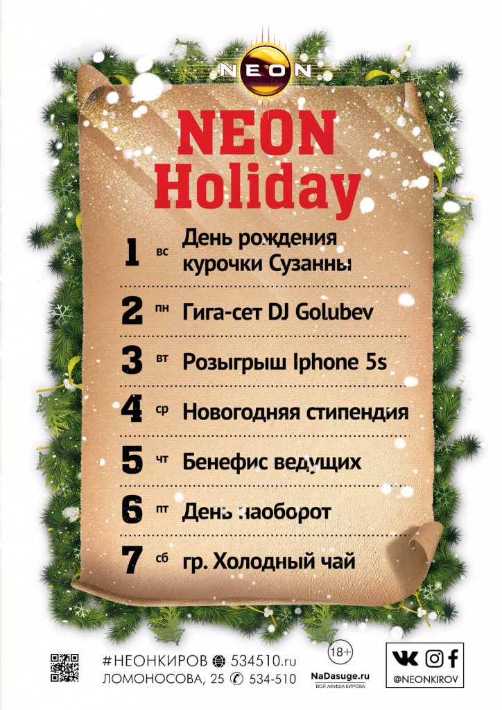 Друзья, все Новогодние Праздники мы планируем сделать максимально насыщенными, атмосферными и сказочными. Мы хотим, чтобы, приходя в РЦ NEON, каждый наш гость чувствовал себя комфортно и в кругу друзей, чтобы ничего не мешало отдыхать в эти традиционные зимние каникулы. Всю неделю мы стараемся разнообразить отдых кировчан и гостей города, сделать его самым запоминающимся и ярким!