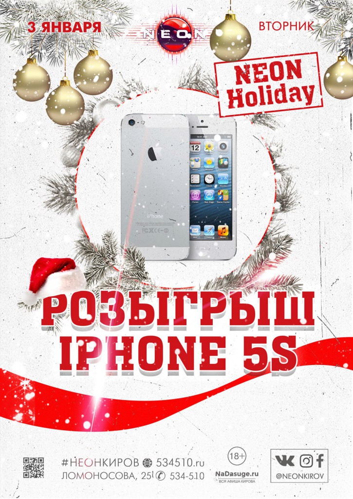 Друзья, в эту среду мы решили снова сделать поистине щедрый Новогодний подарок для наших гостей! Мы дарим возможность всем гостям выиграть стильный и не нуждающийся в представлении телефон IPHONE 5S. Если ты веришь в удачу и успех, то сегодня должен попробовать свои силы в розыгрыше от РЦ NEON! Все что нужно сделать, это прийти, зарегистрироваться у аниматоров с 23:30 до 01:30 в фойе второго этажа, и Вы автоматически становитесь участником лотереи. Приходи сам и зови друзей, ведь шанс выигрыша в большой компании только возрастает!