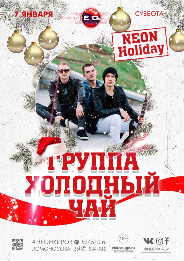 С огромной любовью к нашим гостям по многочисленным просьбам в Рождество мы подготовили для вас настоящий живой концерт. Мы будем кричать, прыгать, восторженно хлопать в ладоши и дико хотеть пить, а жажду нашу в течение всей ночи будет утолять "Холодный чай", крутая кировская группа, которая уже не раз зажигала танцпол в РЦ NEON своими бесконечно любимыми всеми песнями! Не важно, сколько вам лет: 18 или 46, вас ждут кавер-версии на песни групп «Звери», «Мумий Тролль», «Сплин» и многих других! Яркие впечатления, позитивные вибрации, новые знакомства, приятные встречи - все это и куча сюрпризов для вас в эту субботу в РЦ NEON!