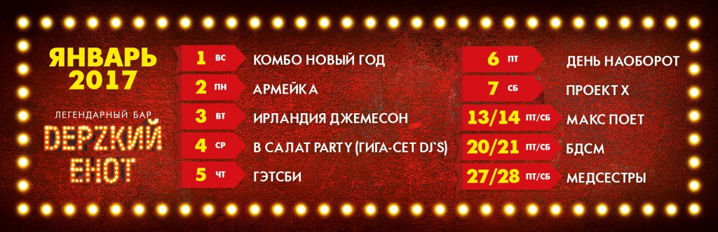 По одному только названию стоит понимать, куда и зачем ты идешь. Мы не будем говорить, что это "самая лучшая" или "наикрутейшая" вечеринка года, что вы пожалеете, если не придете. Нет! Мы просто хотим сказать, что девизом этой ночи будет фраза: "Все, что было в Еноте, остается в Еноте", мы запретим любую видео- и фотосъемку, кроме официального фотоотчета, потому что только в эту ночь мы позволим себе не почти все, а абсолютно все. Даем карт-бланш нашим Еноткам на любые не противоречащие законам действия. Хочешь - оставайся дома, хочешь прийти - будем тебе очень рады. Сегодня пошалим на славу.