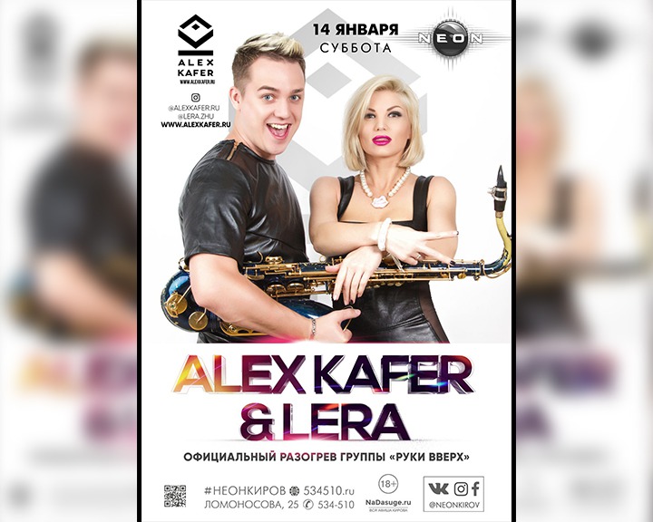 Друзья, в эту субботу с визитом из Екатеринбурга к нам приезжает очень классный дуэт, которого не было у нас в гостях уже 3 года. Ребята являются официальным разогревом группы "Руки Вверх" и очень часто ездят с ними в туры. Просим любить и жаловать: Alex Kafer & Lera. Ребята являются авторами и исполнителями своих треков, ремиксов и кавер-версий на популярные песни русских и иностранных исполнителей. Их выступление сочетает в себе DJ-set, виртуозную игру на саксофоне, Live вокал, а также непосредственное общение с публикой и БУРЮ позитивных эмоций. Отдых на 146 процентов в РЦ NEON обеспечен. Праздники продолжаются, приходите в гости!