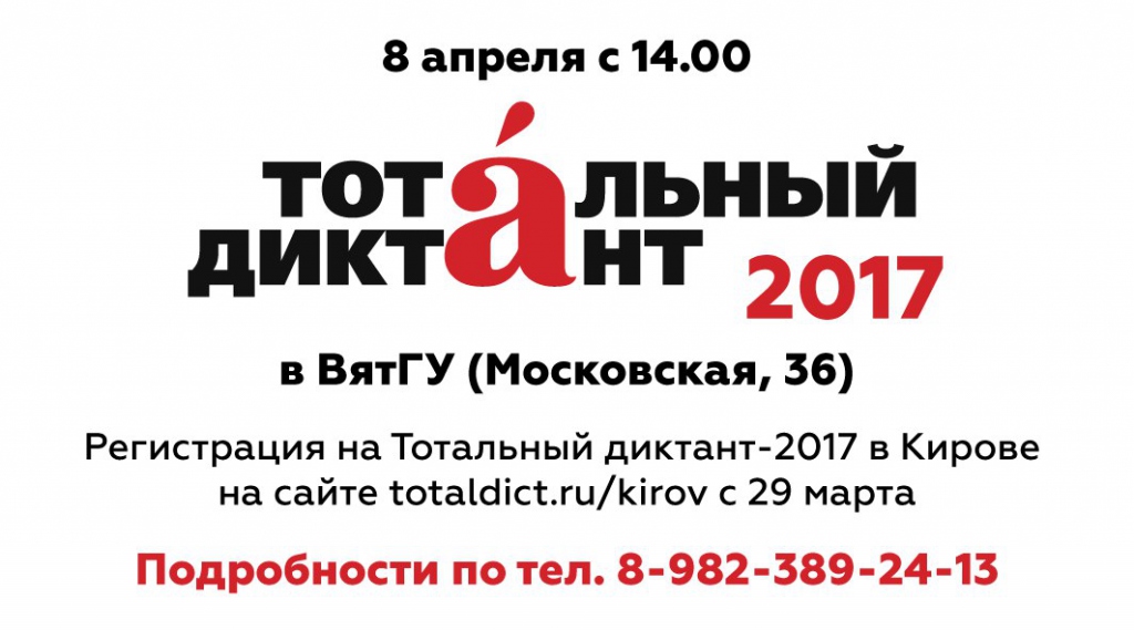 Напомним, что 8 апреля в нашем городе пройдет международная образовательная акция «Тотальный диктант-2017». Диктант кировчане будут писать в стенах ВятГУ с 14.00. Уже с 29 марта на сайте totaldict.ru/kirov откроется регистрация для участников акции.