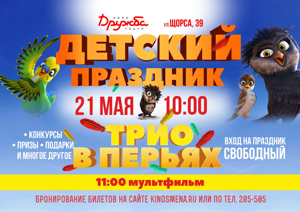 В воскресенье, 21 мая, в кинотеатре "Дружба" состоится детский праздник, приуроченный к премьере мультфильма "Трио в перьях".