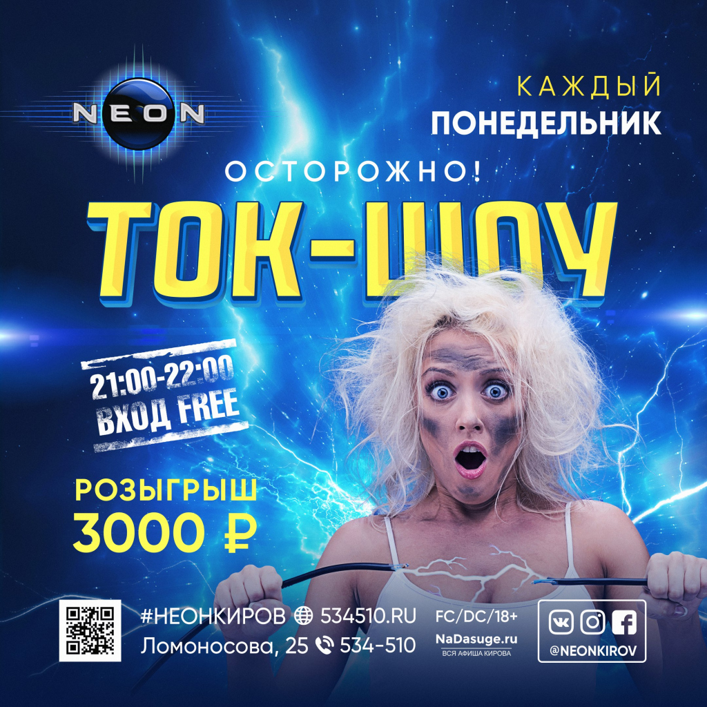 Каждый понедельник в РЦ NEON тебя и твоих друзей ждет настоящее, экстремальное ТОК-ШОУ! Не забывайте о том, что понедельник – это день, когда мы можем продлить свои выходные и пообщаться в кругу staff песонала! Знакомимся, тусим, развлекаемся!