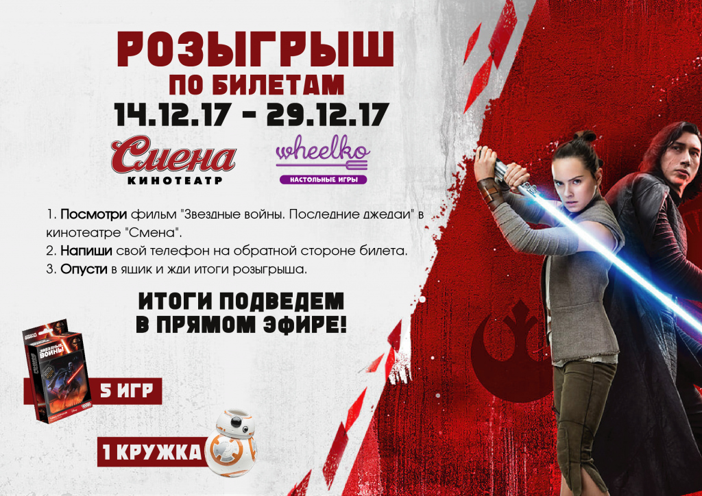 Для остальных кировчан, которые не смогут прийти на премьерный сеанс, кинотеатром и его партнерами подготовлен розыгрыш, участие в котором смогут принять все, кто посмотрят фильм в “Смене”. Главным призом станет эксклюзивный стакан в форме робота BB-8, известного по 7 эпизоду саги, еще 5 человек смогут выиграть тематические настольные игры.