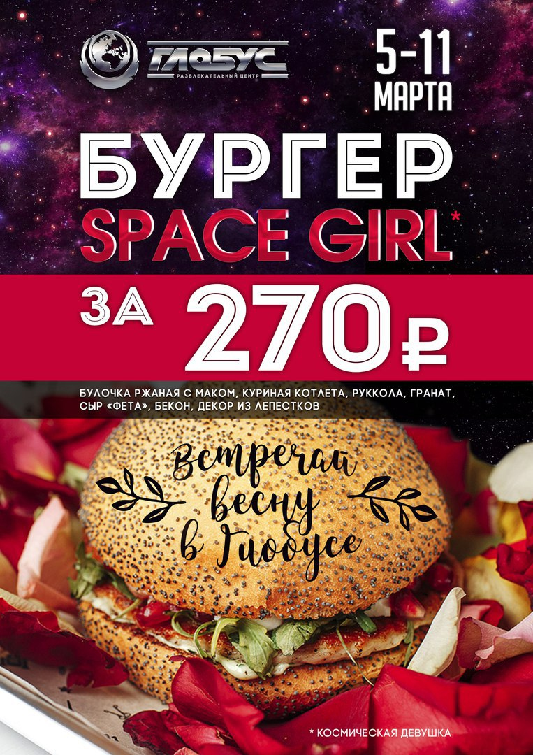 Побалуйте вкусненьким. Все девушки следят за фигурой. Но разве можно отказаться от сочного бургера с нежнейшей куриной котлеткой, рукколой и сыром фета? А если к нему добавить вкусный коктейль? Устоять невозможно! Приходите в бар «Дракон» и «Космобургерную»! С 5 по 11 марта бургер «Space Girl» за 270 рублей, а еще весенний пунш и коктейль «Чего хотят женщины» как комплимент!