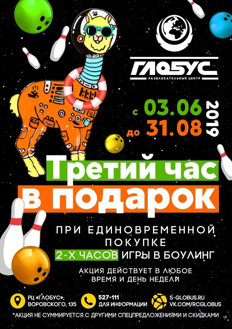 Посмотрели фильм? Не торопитесь уходить! Только до 31 августа при единовременной покупке трех часов игры в боулинг третий час в подарок! Посмотреть время работы и заказать дорожку вы сможете на сайте системы «Глобус».
