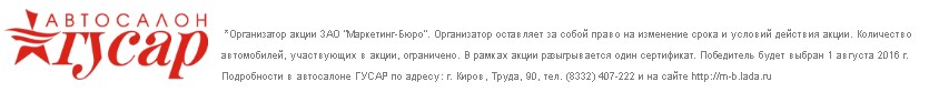 Покупая LADA 4х4 в автосалоне "Гусар" с 04 июня по 31 июля 2016 г. вы имеете возможность выиграть сертификат на сумму 50 000 рублей на приобретение путевки на ваш выбор в ООО "Турагентство "КАРАВАН"!