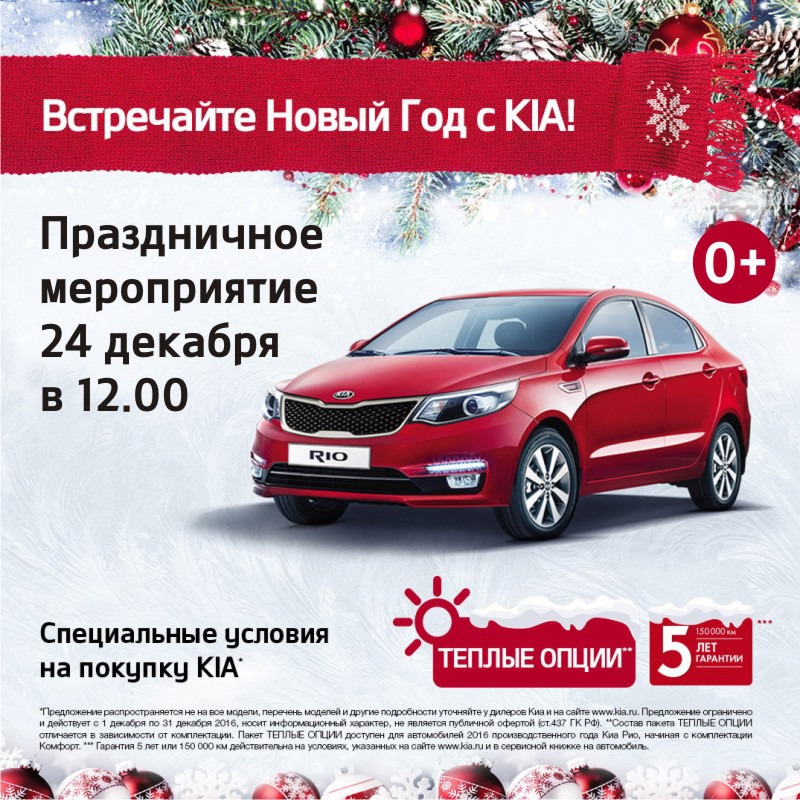 Вас ждет презентация флагманских моделей KIA, тест-драйв и специальные условия на покупку автомобилей KIA с уникальными пакетами «Теплых опций». И, конечно, новогодние сюрпризы, яркие впечатления и развлекательная программа для всей семьи.