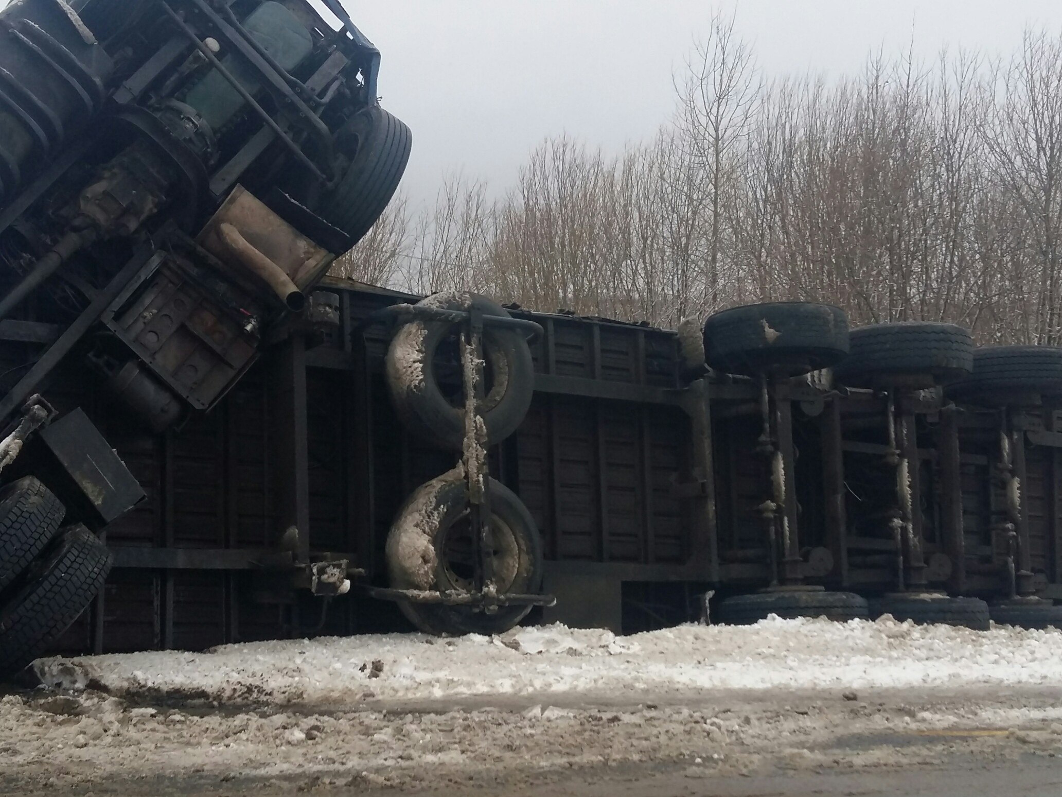Удар был такой силы, что многотонный большегруз опрокинулся.