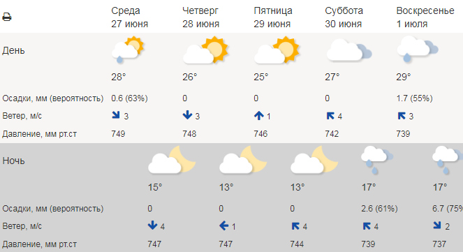 В Гидрометцентре России рассказали, какой будет погода в ближайшие дни. Согласно прогнозу, 28 и 29 июня будет не так жарко, +25°C...+26°C. На выходных, 30 июня и 1 июля, снова будет +27°C...+29°C. Дождь пройдет только в воскресенье.