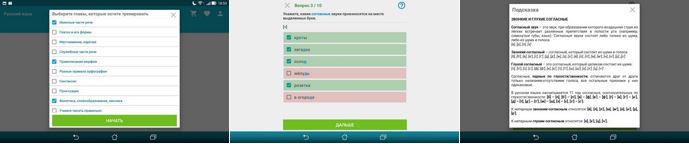 Приложения, которые мы для вас собрали, делятся на два типа – тестовые и диктанты. В тестах вам предстоит отвечать на вопросы с вариантами ответов, в диктанте - восстанавливать пропущенные буквы или знаки препинания.