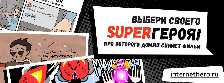 На сайте internethero.ru стартовало первое в России голосование за интернет-супергероя – героя, которого наделяет силой интернет. Персонаж, набравший максимальное количество голосов, станет героем короткометражного художественного фильма. Фильм снимет телеком-оператор «Дом.ru», организатор проекта.