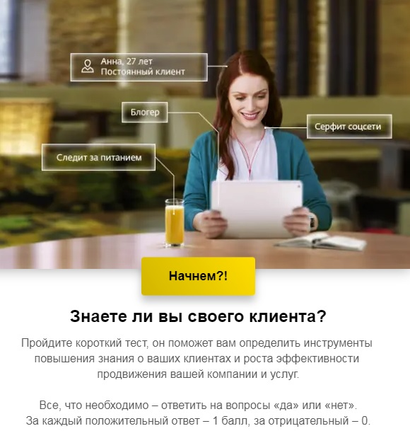 В рамках теста необходимо выбрать один вариант ответа на каждый вопрос и узнать, как можно детализировать портрет клиента и его предпочтения, как увеличить интерес посетителей к услугам компании. Результат покажет, насколько клиентоориентирован тот или иной бизнес и поможет определить инструменты для его продвижения. По итогам теста будут даны рекомендации по использованию современных возможностей Wi-Fi для бизнеса. Их применение позволит оперативно реагировать на потребности и ожидания потребителей, сделает владение информацией об аудитории