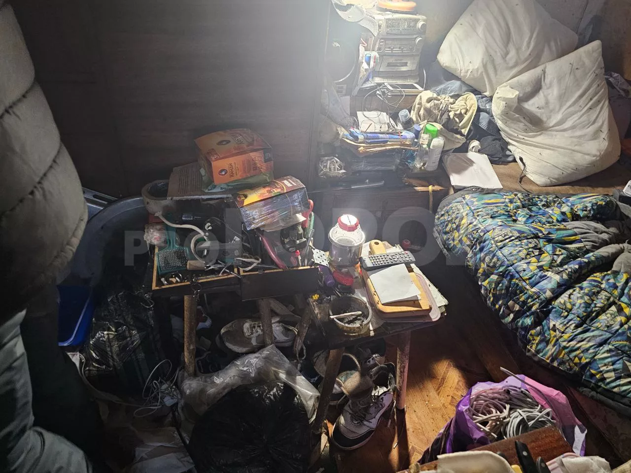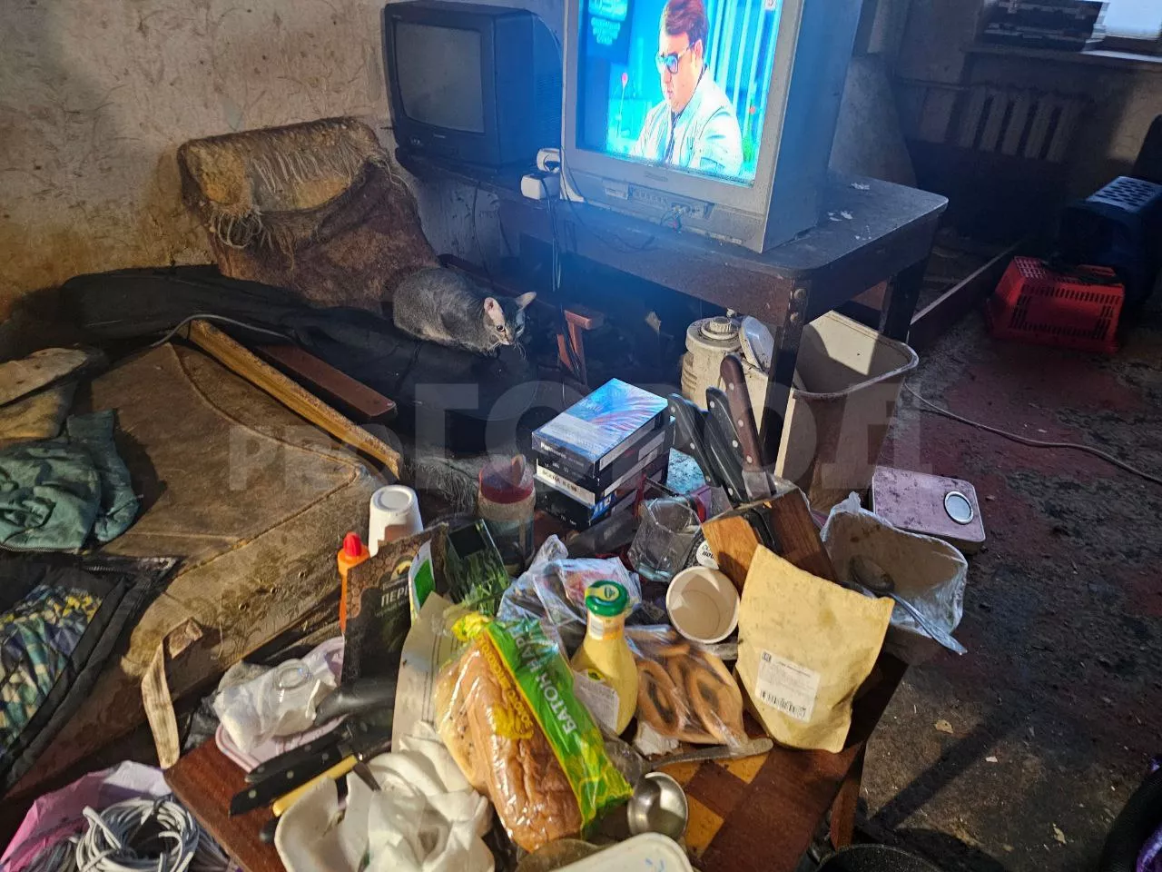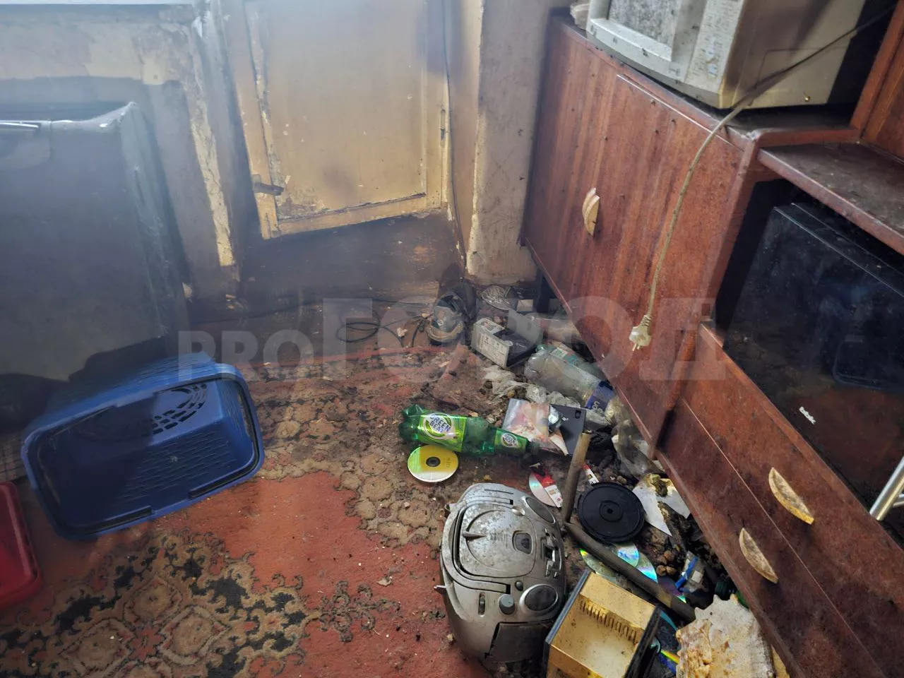 Квартира однокомнатная. Все в темно-желтых цветах. Нас встретилы пауки на паутинах и рои мух, которые летали над посудой, остатками еды, шкафом и диваном. Свободного пространства в квартире нет. Весь пол завален барахлом. Жильцы дома предупреждали, что запах едкий. Нужно было брать противогаз. В действительности, одной маски не хватало для того, чтобы не чувствовать невыносимую вонь.