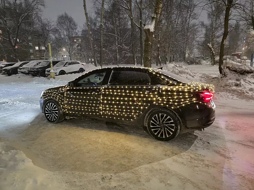 Гирлянда. Впервые использовал гирлянду длиной 30 метров. С каждым годом длина украшения увеличилась. В этом году с другом украшали машину 14 часов. Сначала поклеили 300 метров, но через четыре часа после начала работы украшение сломалось. Тогда перезаказали гирлянду длиною 200 метров. Наряженная "Лада" уже проехала 5000 километров по городу.