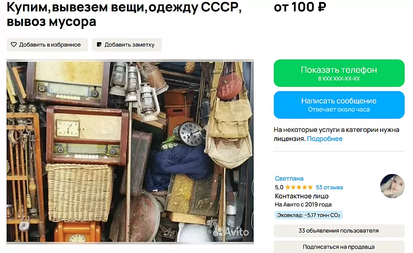 Следующий пользователь сайта объявлений предлагает услугу по разбору и вывозу мусора, ненужных вещей со времен СССР.