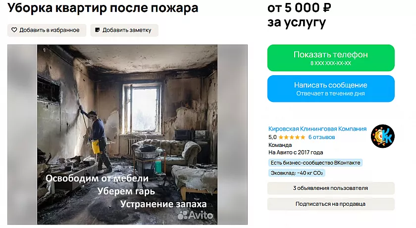 Автор объявления предлагает профессиональную уборку после ЧП. За 5000 рублей команда удаляет сажу, копоть и запах гари с поверхности стен и потолков, проведут глубокую очистку пола и мебели, восстановят внешний вид помещения.