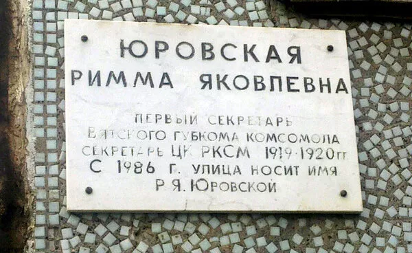 Улица Риммы Юровской получила свое название в 1986 году. Римма - дочь Якова Михайловича Юровского, революционера, одного из главных участников расстрела бывшего императора Николая II и его семьи в Екатеринбурге. В 1919 году на Вятке Римма Юровская организовала первый губернский съезд комсомолов. Там ее избрали первым секретарем Вятского губернского комитета Российского Коммунистического союза молодежи.