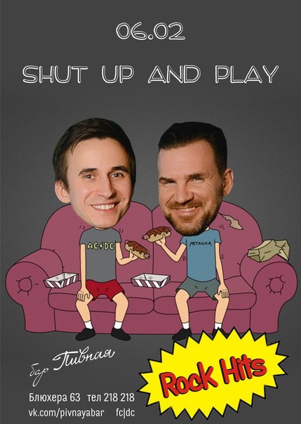 Два товарища: Кирилл Быта и Вася Кегель решили попробовать себя в новом увлекательном занятии: ставить забойные рок-хиты на серии абсолютно новых вечеринок Shut Up and play ROCK HITS! Трек-лист мы держим в секрете до начала party, но поверьте, будет жарко, громко и дико! Только рок, только танцы!
