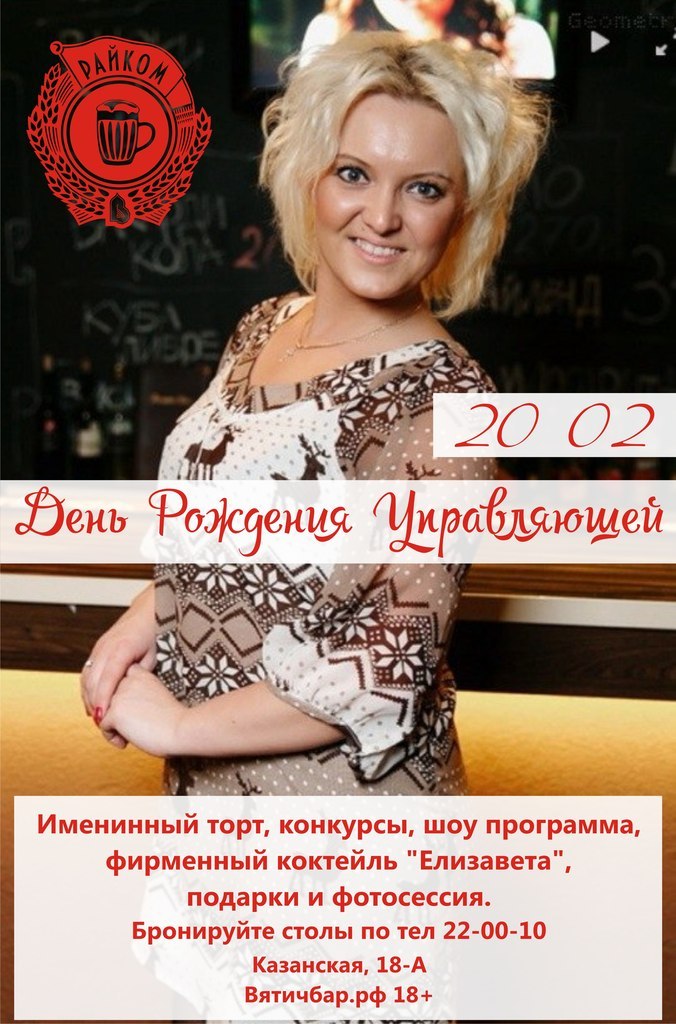 20 Февраля у нашей замечательной Елизаветы, управляющей ресторана "Райком" День Рождения. Мы от души поздравляем ее с праздником и приглашаем всех сегодня вечером на празднование с ведущим, тортом и фирменным коктейлем. Инфо и резерв: 22-00-10