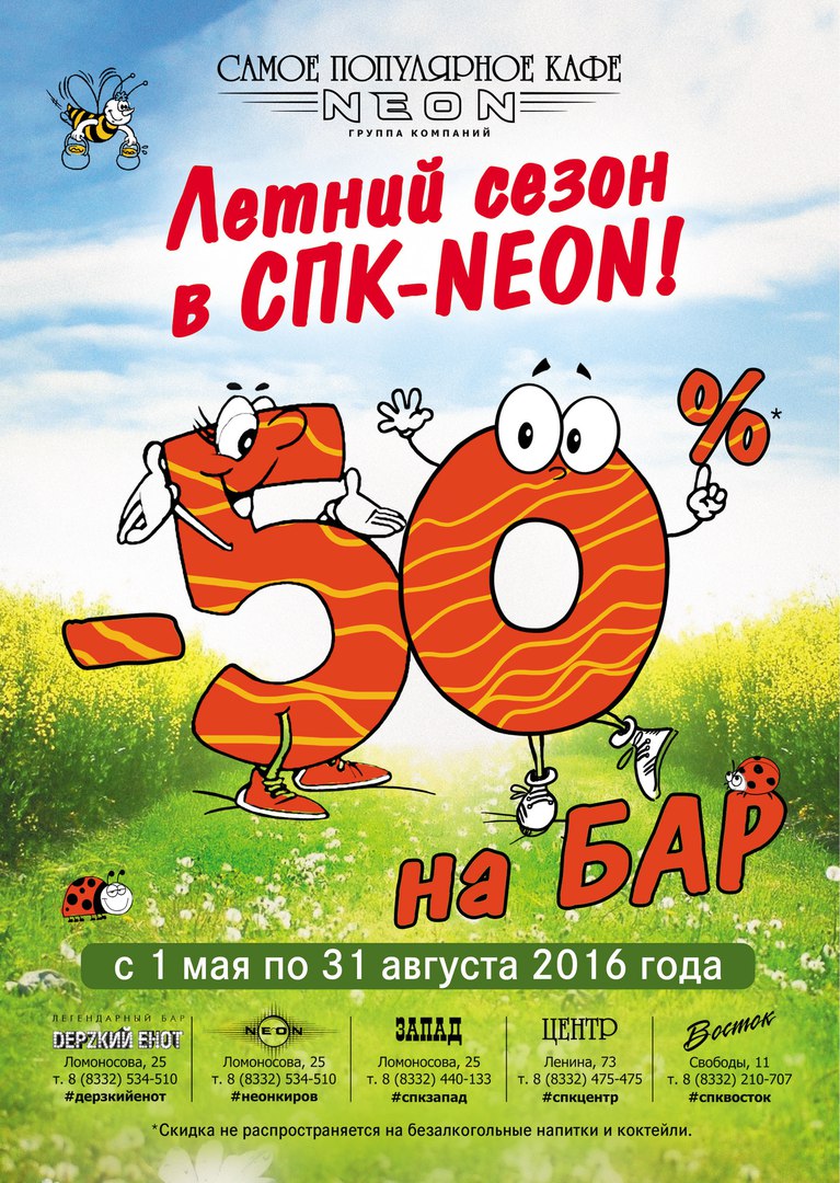 Итак, с 1 мая и до конца лета во всех заведениях группы компаний СПК-NEON будет действовать постоянная скидка 50 процентов на напитки. Да, вы не ослышались! Каждый день, на протяжении 4 месяцев, с момента открытия заведения и до часа его закрытия всем гостям предоставляется скидка 50 процентов на все напитки!