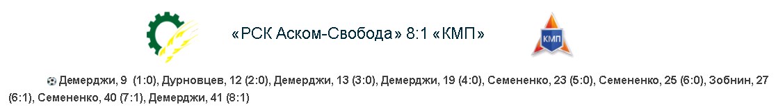 «РСК Аском-Свобода» — явно не из этой лиги. Сельскохозяйственники продолжают громить своих оппонентов. «КМП» снова не смог ничего противопоставить хозяевам. Все вопросы относительно исхода данного противостояния были сняты еще в первом тайме, отправив коллектив машиностроителей в глубочайший накаут со счетом 6:0. Во втором тайме хозяева сбавить обороты, и «КМК» один гол отквитали, но на большее их не хватило.