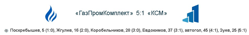ГазПромКомплект продемонстрировали очень яркую игру. С самих первых минут стало ясно, что хозяева с серьезным настроем вышли на поле и уже в первом тайме смогли дважды отличиться. Голы получились на загляденье, один ярче другого. Сначала Поскребышев Павел сильным мощным ударом поразил ворота, а Жгулев Игорь, не менее красивейшим дальним ударом удвоил преимущество. После этого ГазПромКомплект целиком и полностью контролировал встречу и играл по счету, сумев забить в ворота соперника еще несколько мячей. На все, что смог ответить Кировспецмонтаж, так это на гол престижа, в одной из контратак. 5:1 — ГазПромКомплект выходит в лидеры в серебряном Play-Off.