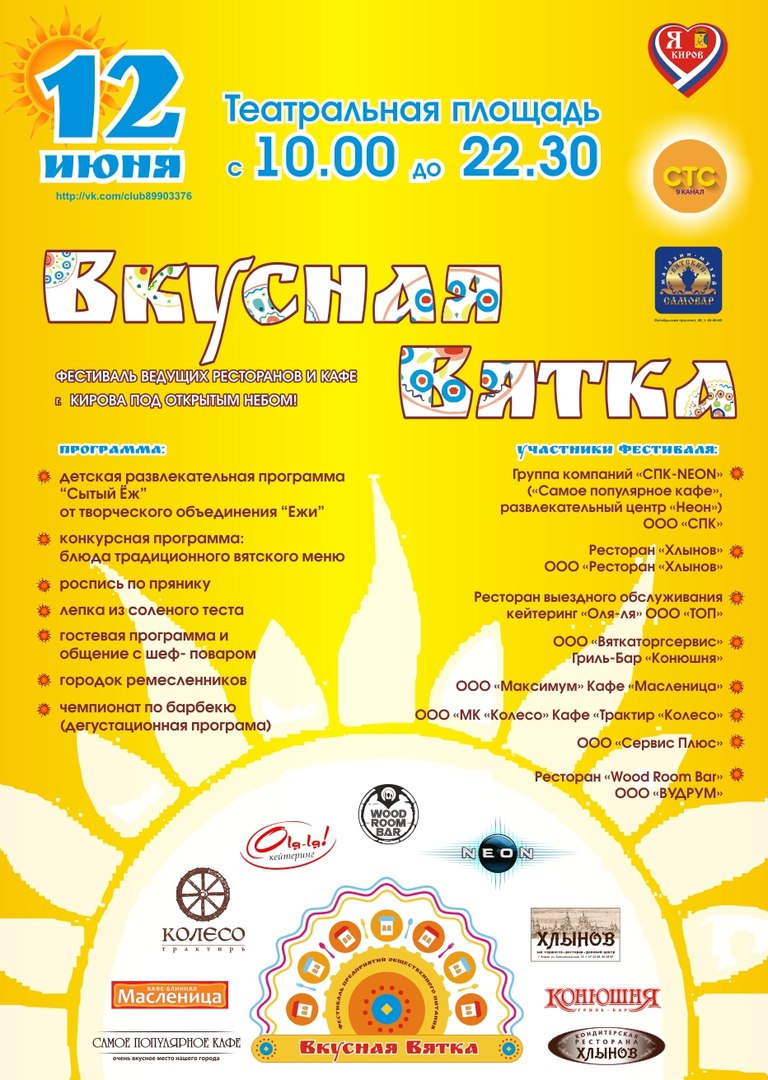 Друзья, 12 июня, в рамках празднования Дня города Кирова на Театральной площади пройдет фестиваль "Вкусная Вятка". Мы рады сообщить всем, что ГК СПК-NEON примет участие в этом гастрономическом празднике и развернет свои кафе-шатры с традиционными вятскими блюдами.
