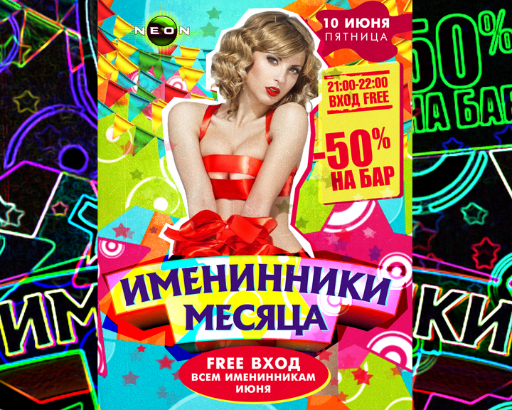 В преддверии праздников Дня России и Дня города мы решили ввести новую и очень приятную вечеринку для всех именинников месяца! Друзья в эту пятницу мы открываем наши двери всем, кто родился в первый месяц лета! Не важно 1 июня или 30 – ты приглашен и на протяжении всей ночи зайдешь к нам бесплатно! Всех именинников ждет яркая шоу-программа от наших барменов, вкусные напитки, танцевальная музыка и хорошие эмоции, заряда от которых хватит на все выходные! Не забываем, что действует скидка 50 процентов на бар! Ждем всех в гости!
