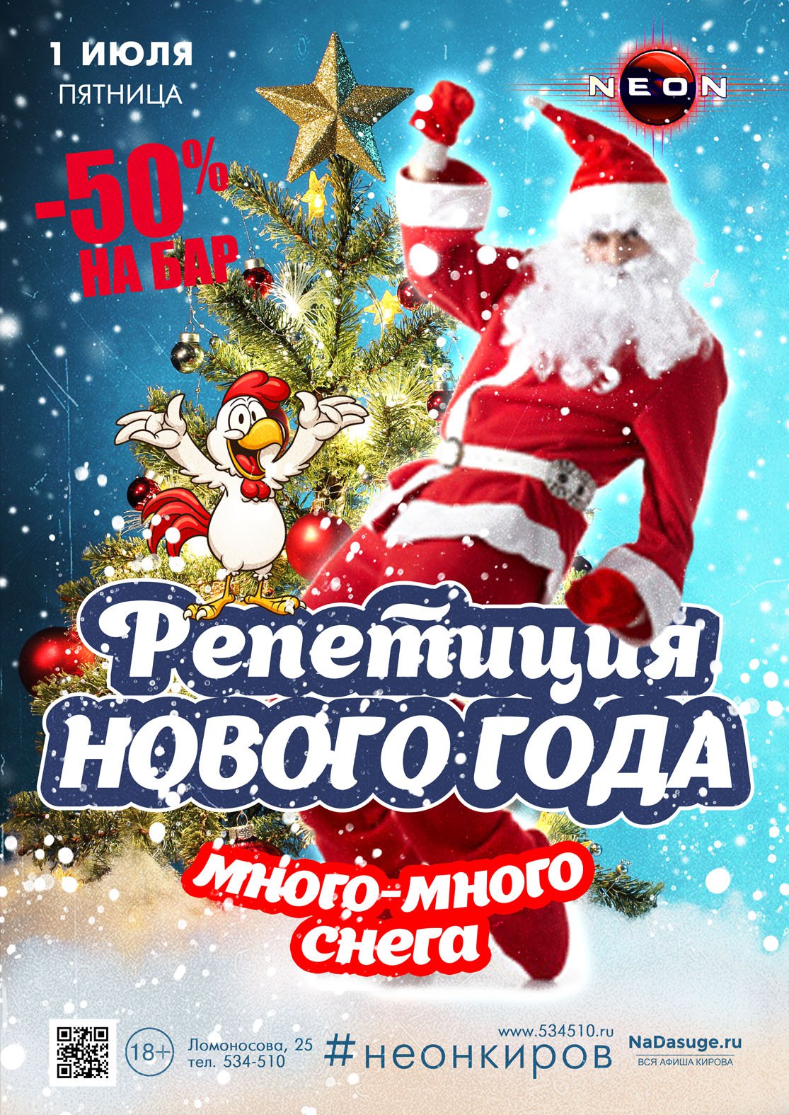 Второй месяц лета начался, а это значит, нужно провести его незабываемо, ведь впечатления о лете сейчас подпорчены погодой. РЦ "NEON" дарит отличное настроение и шоу каждый день. Раз уж на улице холодно, мы решили провести репетицию Нового года, вдруг природа одумается и исправится. В эту ночь вас ждет нереально много снега, согревающие напитки, добрые эмоции и праздничное настроение. В гости к нам заглянет настоящий Дед Мороз с подарками, поводит хороводы и подарит всем хорошим мальчикам и девочкам подарки! Не забывайте, что до конца лета действует суперакция - 50 процентов скидка на бар всю ночь!