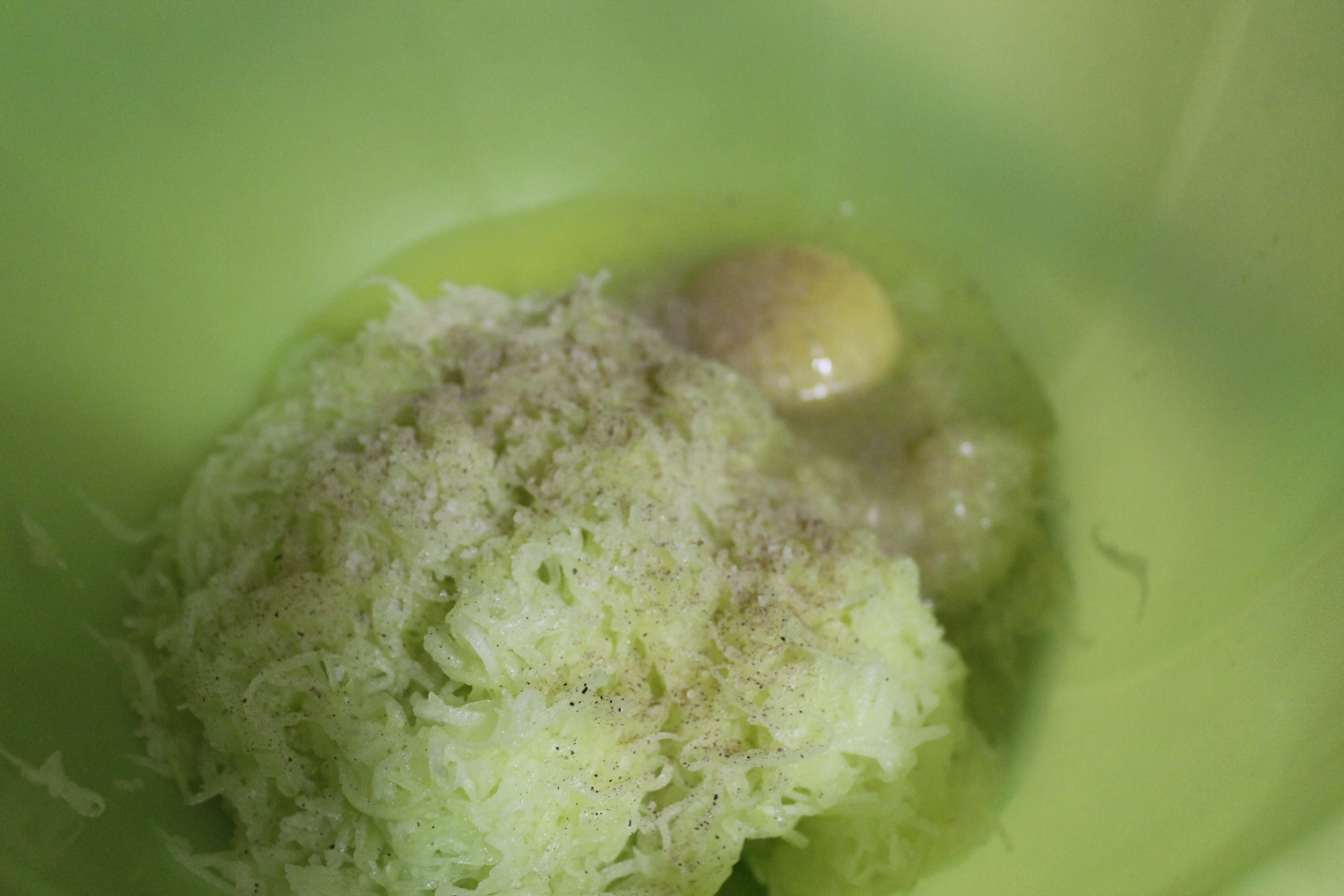 Кабачок вымыть, очистить и натереть на мелкой терке. Добавить яйцо, соль и перец, перемешать.