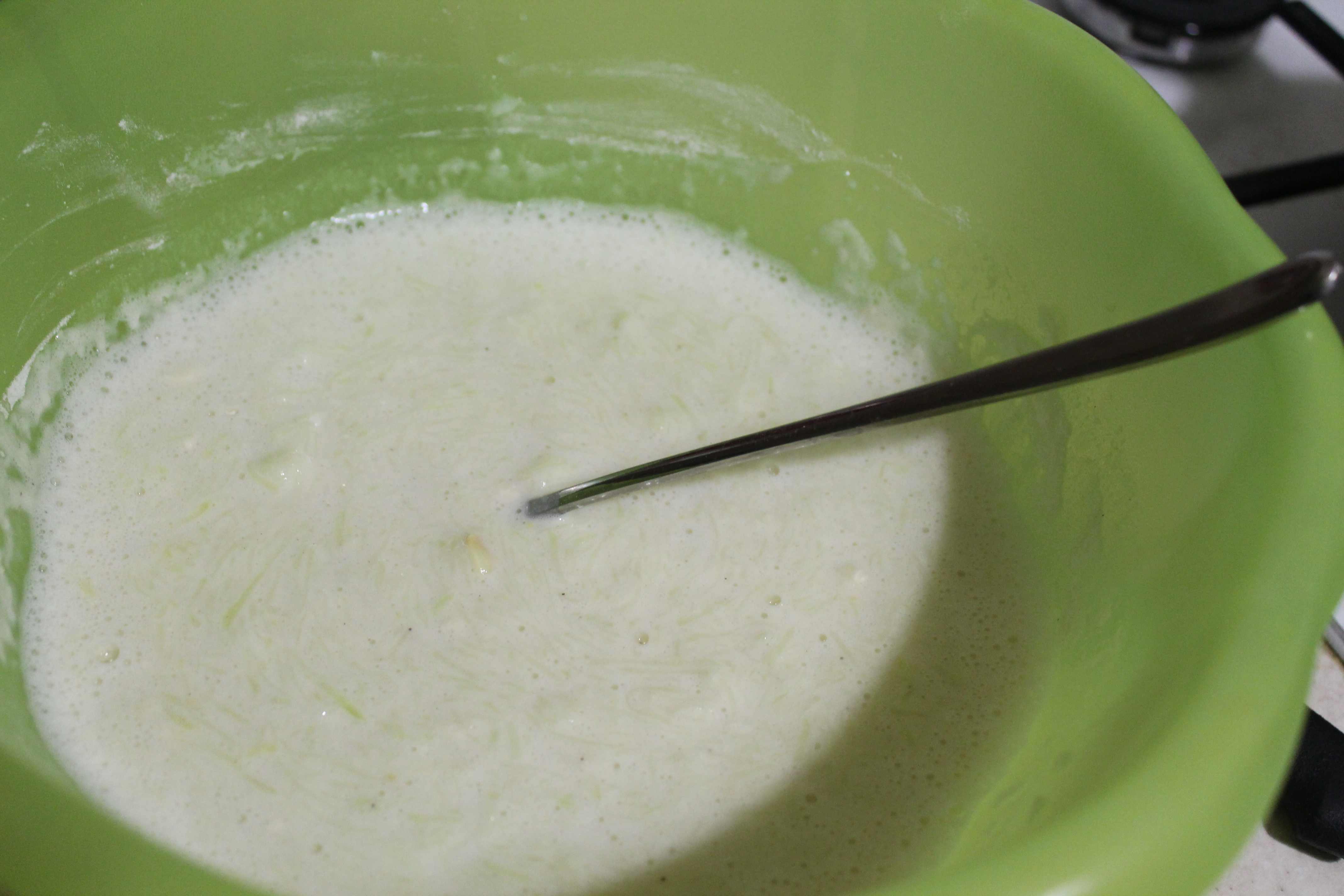 Влить молоко, перемешать. Постепенно всыпать муку. Должно получиться негустое тесто для блинов. Если тесто получится слишком густым, блины будут толстыми и сломаются при сворачивании.