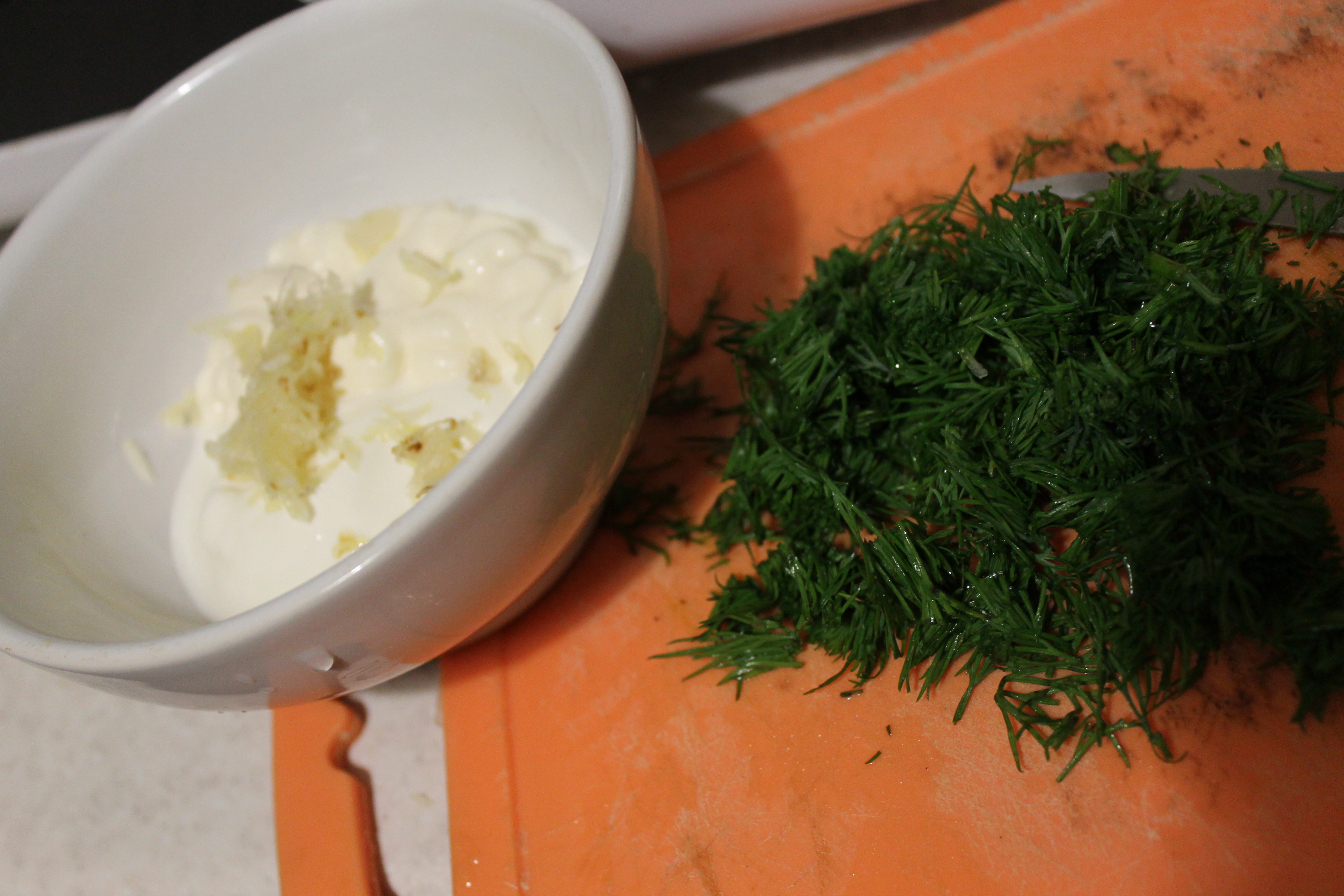 Для начинки смешать майонез, сметану, мелко нарезанный укроп и пропущенный через пресс чеснок.