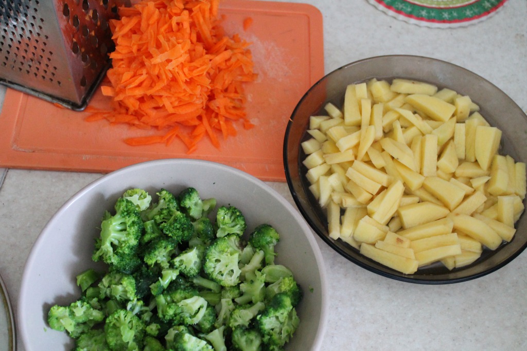 Морковку трем на терке и тоже обжариваем. Брокколи разделяем по соцветиям, на кусочки помельче. Картошку режем.