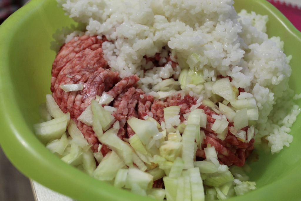 Отварить рис на медленном огне почти до готовности. Остудить. Одну луковицу мелко нарезать. Фарш смешать с остывшим рисом и луком.