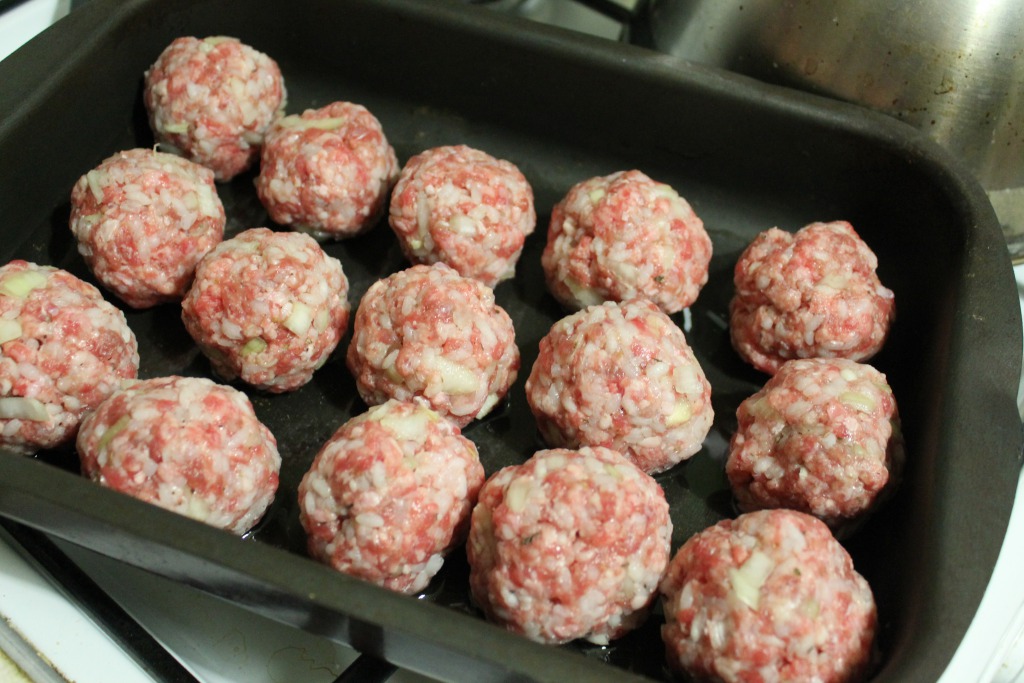 Добавить соль и специи, тщательно вымесить. Из фарша сформировать тефтели (удобно это делать мокрыми руками) и уложить их в глубокий противень.