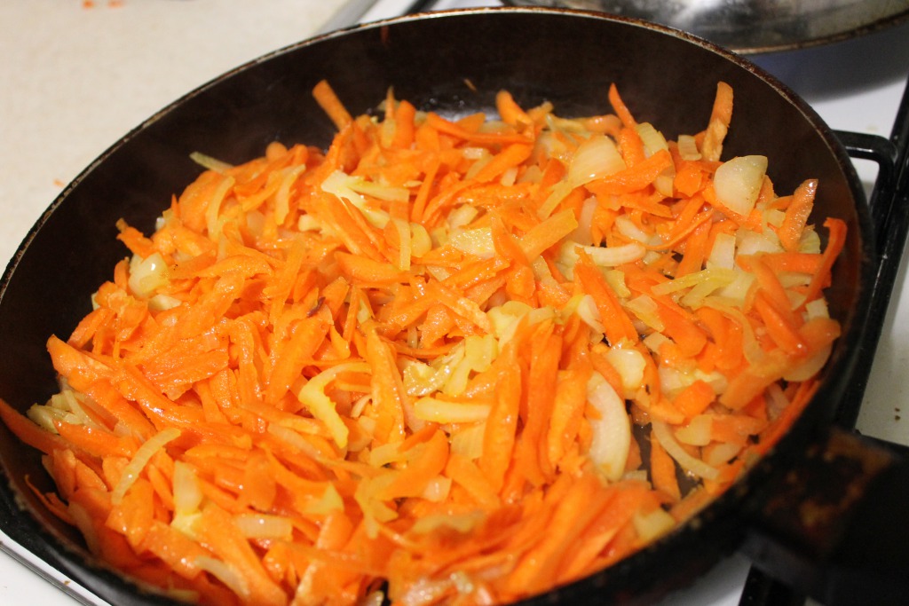 Лук нарезать, морковь натереть на терке, обжарить лук и морковь на растительном масле.