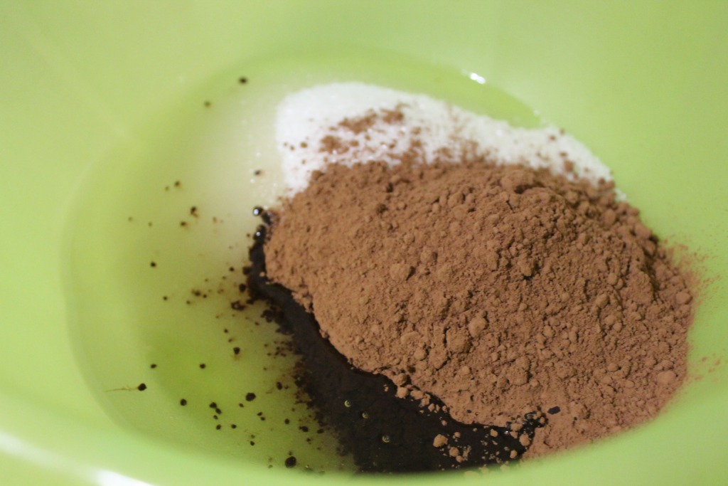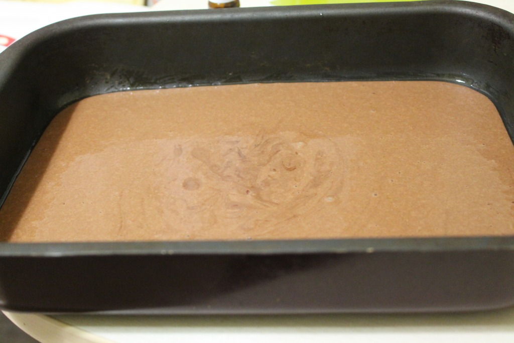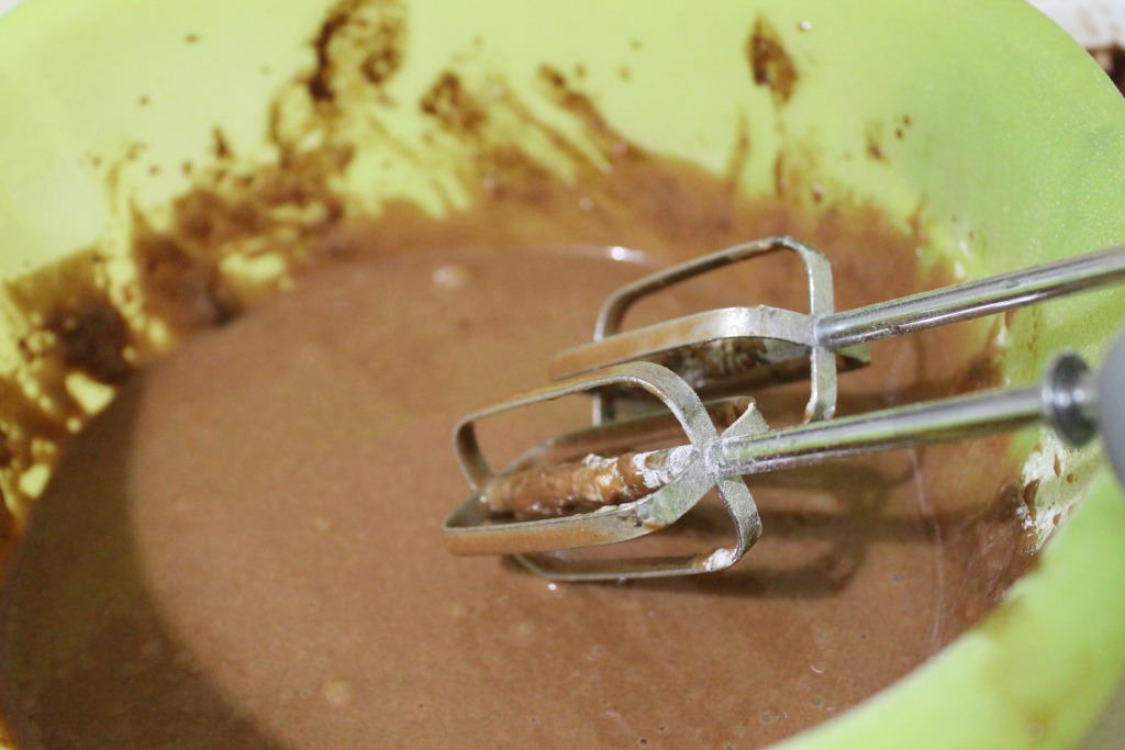 Взбить с помощью миксера сахар, какао, молоко и растительное масло. Перелить половину смеси в отдельную миску.