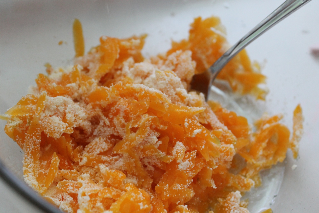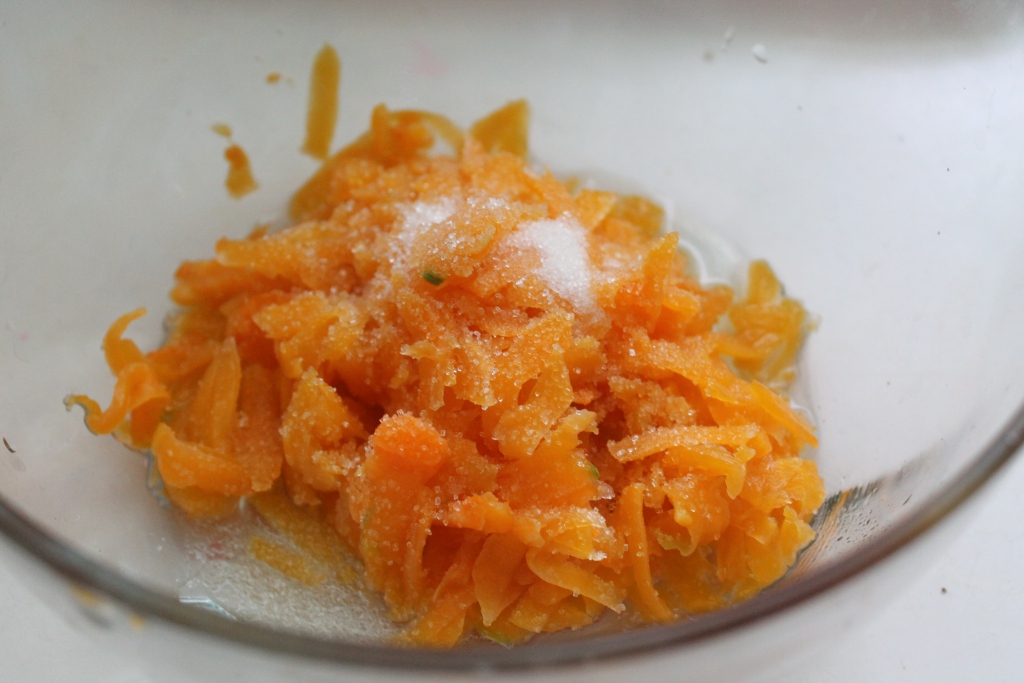 Тыкву натереть на крупной терке и присыпать сахаром, чтобы дала сок.