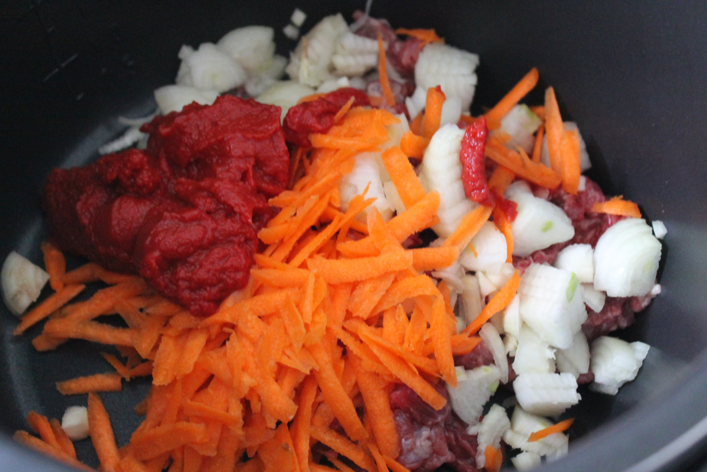 В чашу мультиварки выкладываем эти ингредиенты, добавляем томатную пасту, соль и перемешиваем.