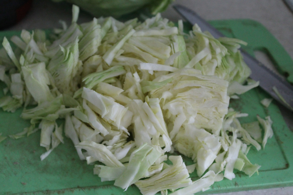 Сверху укладываем нашинкованную капусту. Наливаем воду. Готовим 35 минут.