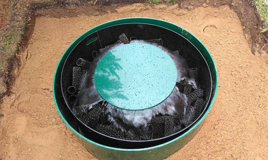 Установка аэрационной станции возможна даже в плывун. Чтобы стенки котлована не обваливались, сооружается опалубка, а поступающая грунтовая вода откачивается мотопомпой.