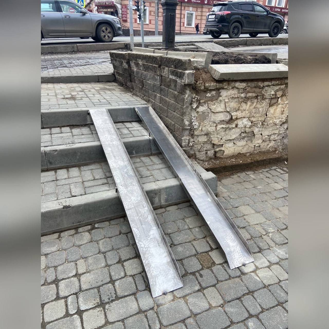 Конечно, пандус был спроектирован изначально, по-другому и быть не могло, но, к сожалению, подрядчик на два дня подвел со сроками. Понимая задержки, сотрудники заведения и строители все дни работ всячески помогали пешеходам преодолевать препятствие.