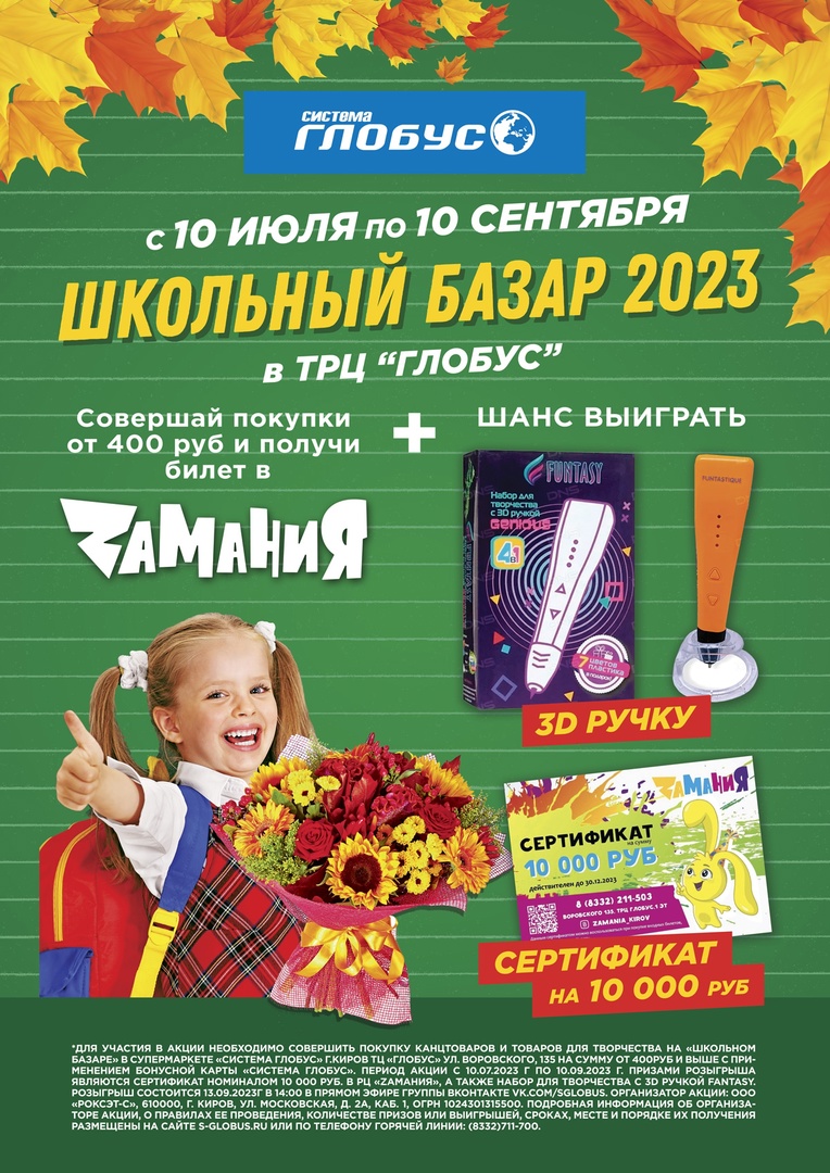 с 10.07.2023 по 10.09.2023 совершите покупку любых товаров к школе на сумму от 400 рублей с применением Бонусной карты "Система Глобус" в супермаркете на Воровского, 135;