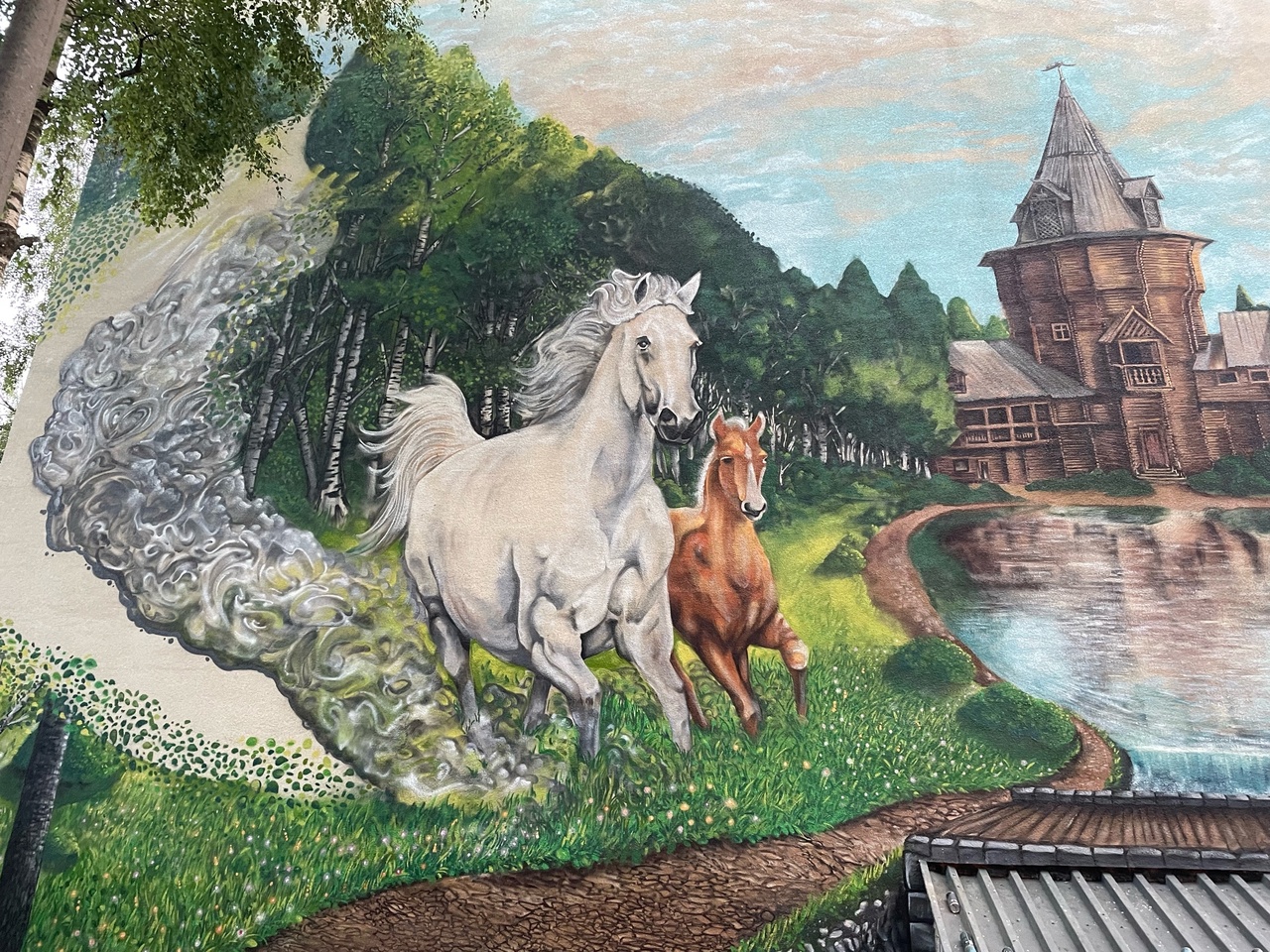 Моей идеей было отразить историческое название улицы. Валентина Петровна хотела разнообразить и оживить картинку, поэтому появились кони. На создание граффити потратил в итоге 50 часов.